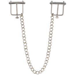 De stevige stalen klemmen zijn verbonden met een ketting die, wanneer eraan wordt getrokken, een extra trekkerig gevoel geeft aan je gevoelige tepels.