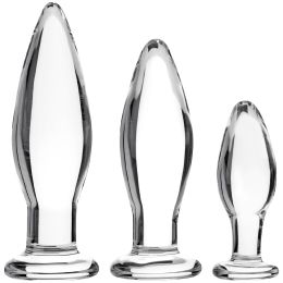 De set bestaat uit drie buttplugs in verschillende maten, zodat je geleidelijk kunt wennen aan een vollere stimulatie. Ze zijn gemaakt van borosilicaatglas in een elegante stijl en zien er tegelijkertijd robuust en verfijnd uit.